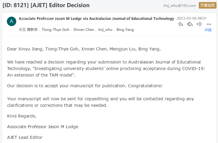 近日,yl6809永利智慧学习研究团队就员工对2020年春季疫情期间各高校普遍采取的视频会议监考系统使用感受展开大规模调查的研究成果“Investigating university students’online proctoring acceptance during COVID-19: An extension of the TAM model”(新冠肺炎期间老员工在线监考接受度调查:TAM模型的延伸),被教育技术领域知名期刊Australasian Journal of Educational Technology录用。该期刊为JCR Q1分区刊物。yl6809永利刘梦君副教授、杨兵教授、外国语公司陈欣然老师为论文共同作者,研究生蒋新宇为论文第一作者,yl6809永利为第一通讯单位。该工作得到了国家自然科学基金项目、湖北省自然科学基金项目和yl6809永利教学改革研究项目的资助。