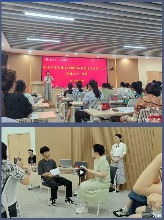 心理学系鲁婷副教授重点介绍了中小员工个体心理辅导的基本理论与技术,模拟展示了个体心理辅导的会谈技术中共情、倾听、指导的正确做法和错误做法,精准生动的现场实操教学案例迅速激起了学员们的兴趣,大家都自发鼓起掌来。