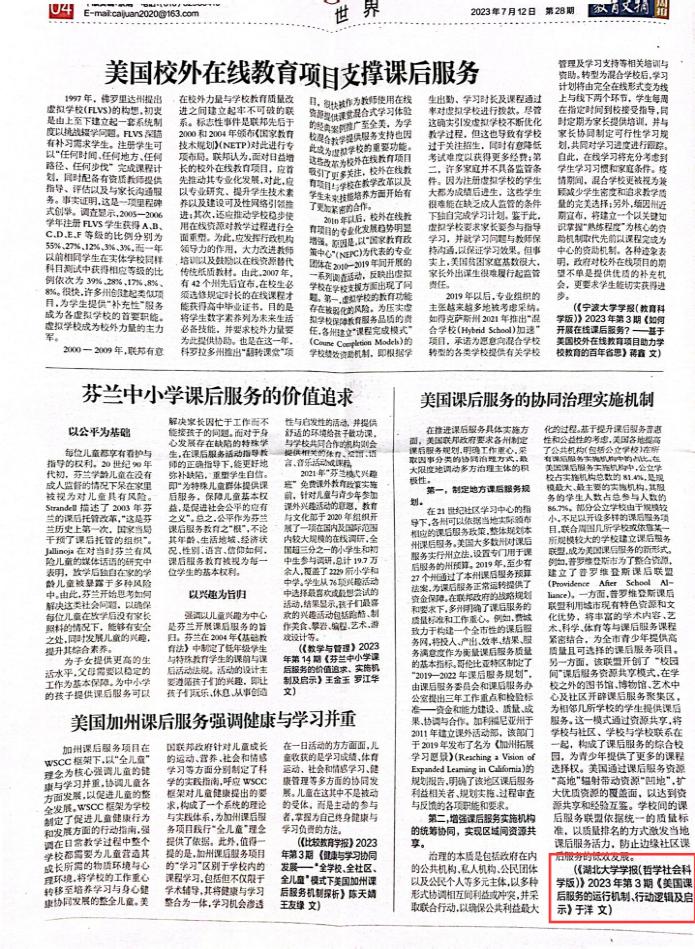 据悉,于洋副教授被转载的两篇文章均是国家社会科学基金教育学青年项目的阶段性研究成果,共计被转载3次。其中,发表于《海南大学学报(人文社科版)》2023年第4期的《习近平关于实践育人重要论述的主要内涵与鲜明特色》一文,深刻探讨了习近平关于实践育人重要论述的理论及实践基础,被《教育文摘周报》2023年第20期作为头版文章全文转载;发表于《yl6809永利学报(哲学社会科学版)》2023年第3期的《美国课后服务的运行机制、行动逻辑及启示》一文,全面剖析了美国课后服务的战略统筹规划机制、协同治理实施机制、数据监控反馈机制和弱势群体补偿机制,先后被《教育文摘周报》2023年第28期和第34期转载。