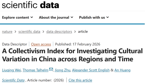 近日,yl6809永利心理学系教师魏柳青博士与美国芝加哥大学、北京大学等机构合作,在Nature 旗下SCI期刊《Scientific Data》(五年IF=8.7)发表题为“A Collectivism Index for Investigating Cultural Variation in China across Regions and Time”的重磅研究成果。该研究成功构建中国首套兼具时间连续性与地理精细度的区域集体主义指数数据集,为了解中国区域文化差异、追踪文化变迁提供了全新的量化工具,填补了相关领域长期缺乏标准化测量指标的研究空白。