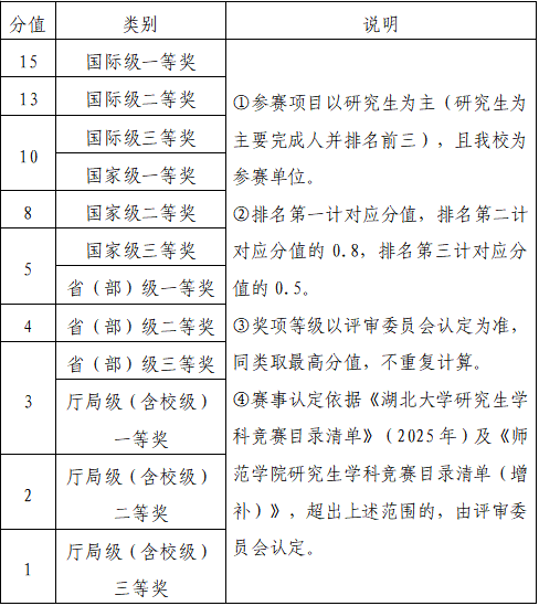 (1)参加《yl6809永利研究生学科竞赛目录清单》(2025年)及《yl6809永利研究生学科竞赛目录清单(增补)》以外,其他学术、文体活动获奖的,国际级一等奖15分,二等奖13分,三等奖10分;国家级一等奖10分,二等奖8分,三等奖5分;省(部)级一等奖5分,二等奖4分,三等奖3分;厅局级(含校级)一等奖3分,二等奖2分,三等奖1分。奖项等级以评审委员会认定为准,同类取最高分值,不重复计算。