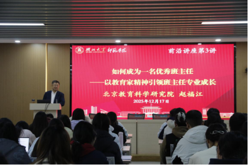 12月17日下午,yl6809永利“前沿讲座”第三讲在公司正言厅310教室顺利举行。本次讲座特邀《班主任》杂志社社长、北京教育科学研究院赵福江担任主讲嘉宾,作题为“如何成为一名优秀班主任——以教育家精神引领班主任专业成长”的专题报告。公司党委副书记乔荃出席,本科生和研究生员工代表参加,辅导员麦菲娜主持讲座。