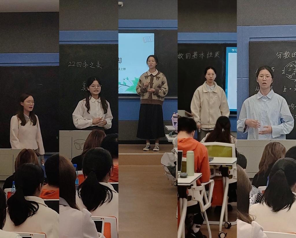参赛选手来自2021级小学教育专业5名师范生,教学内容分为小学语文和小学数学两个学科,评委们从教学设计、课件制作、即席演讲、模拟上课及板书设计等四个方面进行综合考核。